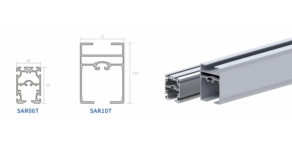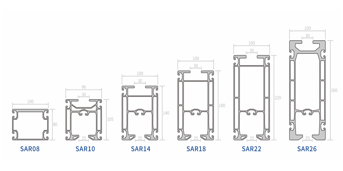 | SAR08 | อะลูมิเนียม อโนไดซ์ | 4.1กก./ม | 152ซม.^4/202ซม.^4 | 30ซม.^3/40ซม.^3 |