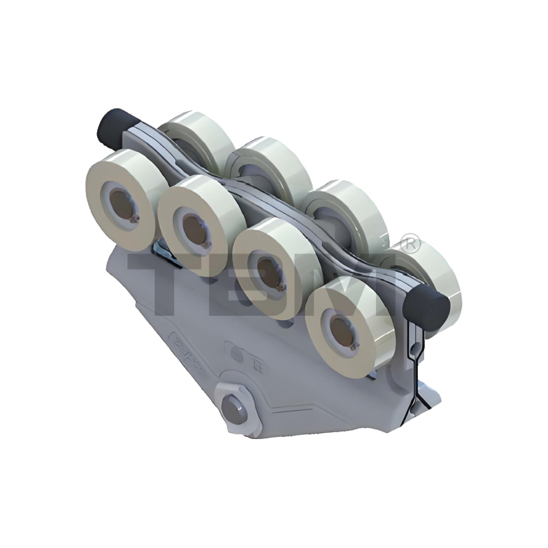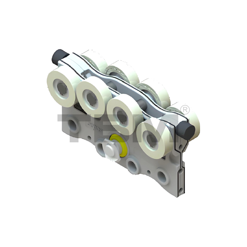 ■ รถเข็นหล่อขึ้นรูป/หล่อจากไนลอนที่มีความแข็งแรงสูง ทนทานต่อการสึกหรอ เพื่อการเลื่อนที่ราบรื่นและใช้งานง่าย Two rows of upper and lower rollers provide pry-resistant and anti-bias protection.