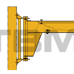 | แกนแกว่งของเครนแขนหมุน 270° ตั้งอยู่บนสลักสองตัวเหนือเสา มีการติดตั้งแบริ่งรองรับเครื่องบินและบูชทองแดงแบบหล่อลื่นในตัวระหว่างข้อต่อบนและล่างกับแกนแกว่ง ช่วยให้มั่นใจได้ถึงการแกว่งที่ยืดหยุ่นและลดแรงเฉื่อยของแขนหมุนเมื่อหยุด มีการจำกัดมุมการแกว่งภายนอกเพื่อปรับมุมการแกว่งของแขนหมุน |